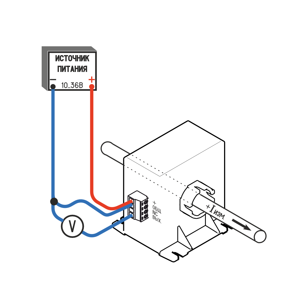 Внутри преобразователя стоит нагрузочный резистор вместе с буферным усилителем, которые формируют выходное напряжение, пропорциональное мгновенным значениям силы измеряемого тока величиной от 0 до 5 В.