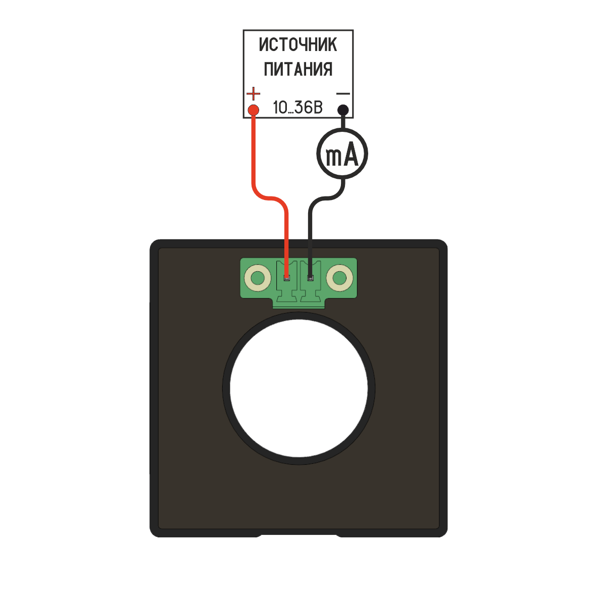 Ток, протекающий через шину, наводит в магнитопроводе магнитную индукцию. Установленный в зазоре магнитопровода датчик Холла преобразует напряженность магнитного поля в зазоре в пропорциональное напряжение соответствующего знака.