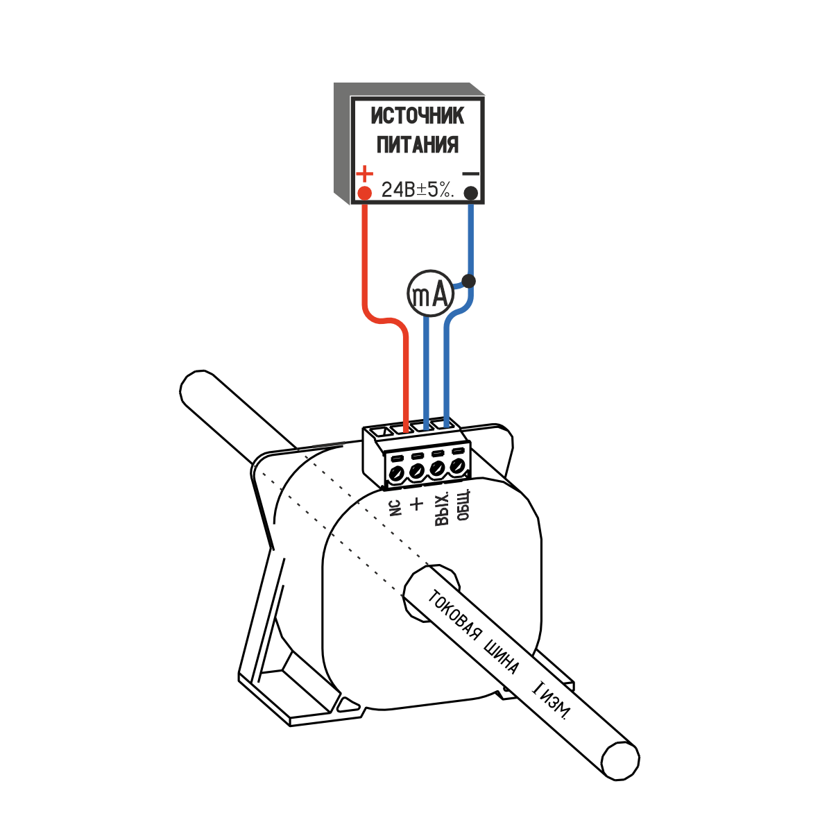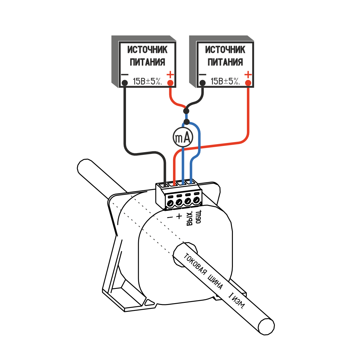 Состоят из замкнутого магнитопровода с обмоткой, датчиком Холла в его зазоре и печатной платы с электронной схемой обработки сигнала, размещенных в изолированном корпусе.Ток, протекающий через шину, наводит в магнитопроводе магнитную индукцию. Установленный в зазоре магнитопровода датчик Холла преобразует напряженность магнитного поля в зазоре в пропорциональное напряжение соответствующего знака.