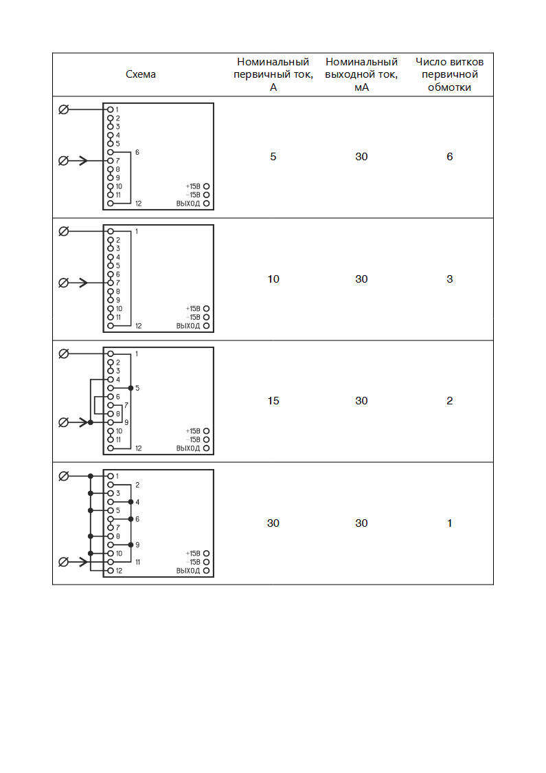 Первичная обмотка датчика содержит 6 витков, выводы которых соединены с клеммой на корпусе датчика. Коммутируя контакты клеммы различными способами, потребитель изменяет значение номинального измеряемого тока в пределах от 5 до 30 А